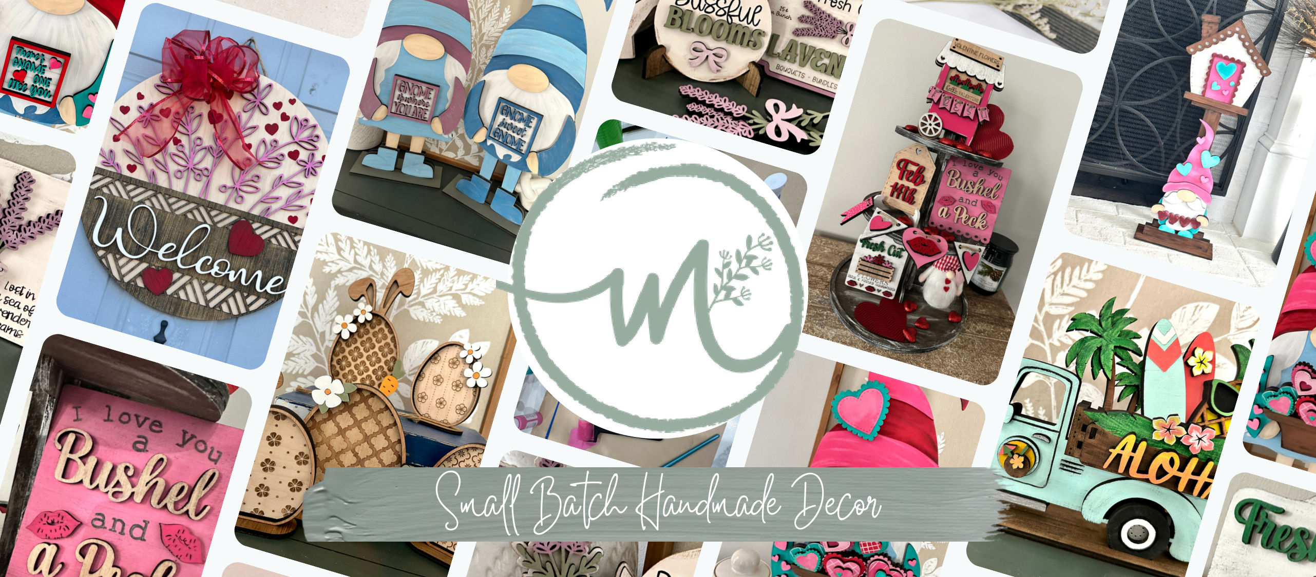 Each piece begins as raw wood in our homestead studio and is thoughtfully designed, laser cut, painted, assembled, and finished by hand. From layered wood signs and farmhouse door decor to interchangeable seasonal decor systems and tiered tray sets, every collection is crafted in limited quantities.